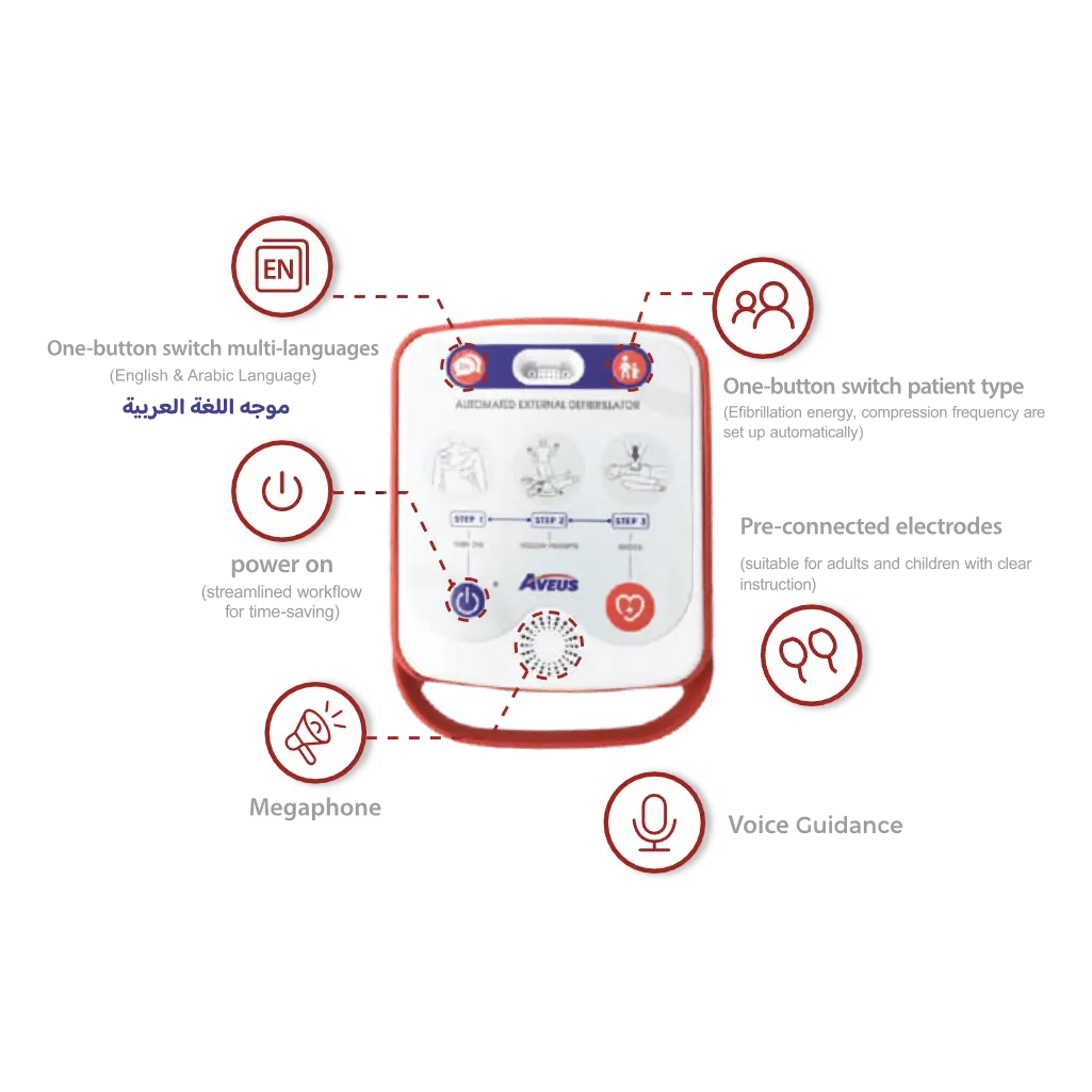 (Press the power button, the AED turns on within 2s. and the voice guidance is activated, which immediately guides you on how to operate the AED)